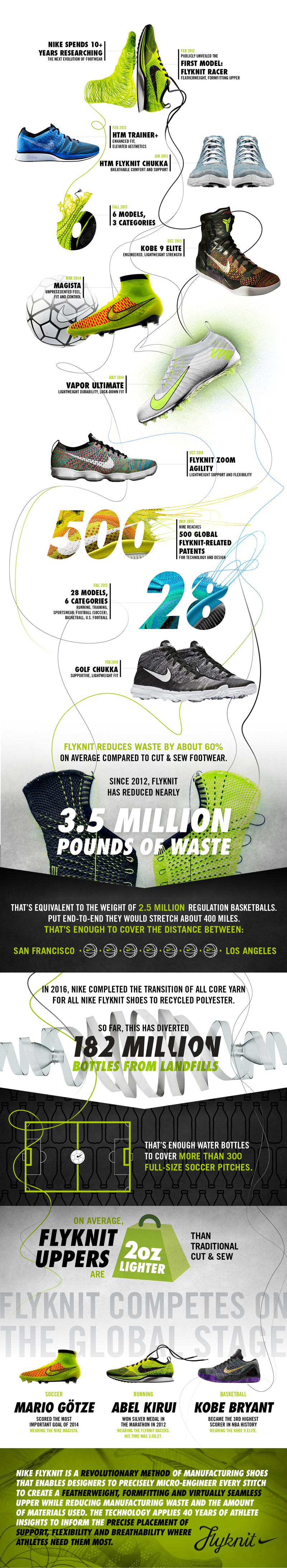 INFOGRAPHIC // NIKE // 2016Nike introduced Flyknit in February 2012 and now to celebrate its fourth birthday, we were asked to create an infographic chronicling the lightweight sneaker tech’s complete history from inception to application, and also highlighting the sustainabilty aspects of the technology.Created while working at Weber Shandwick.